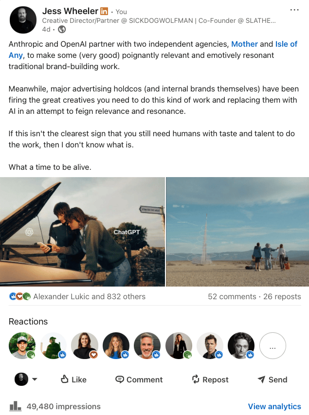 After watching the new brand campaigns from Anthropic and OpenAI, I bashed up a quick post on my phone that caught fire very quickly. (It’s funny how it’s always the innocuous on-the-fly stuff that takes off.)